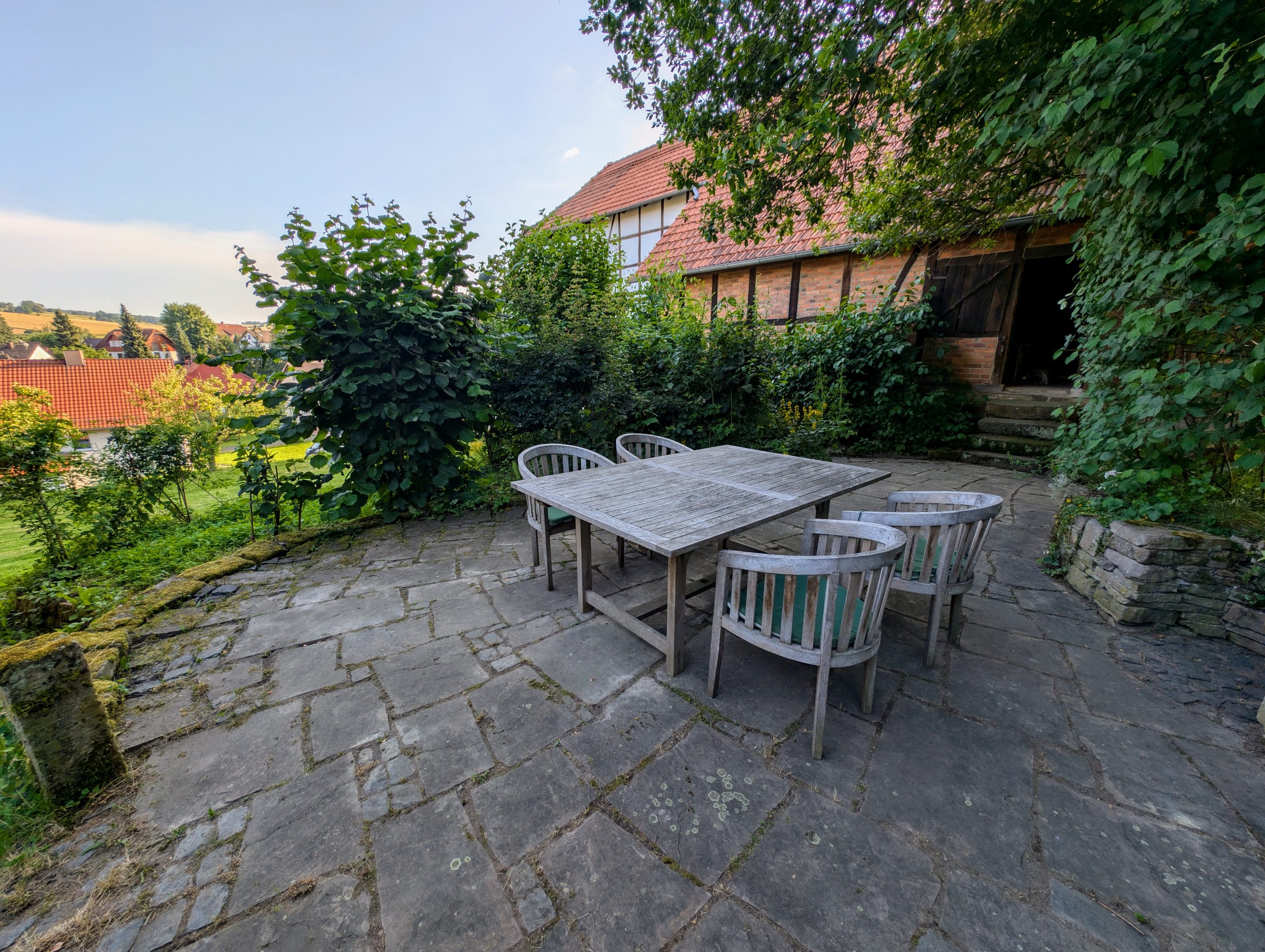 Der überdachte Innenhof mit Tischtennisplatte eignet sich perfekt für gemeinsame Aktivitäten. Der große, naturbelassene Garten grenzt direkt an eine Streuobstwiese, wo Sie im Herbst frische Früchte ernten können.